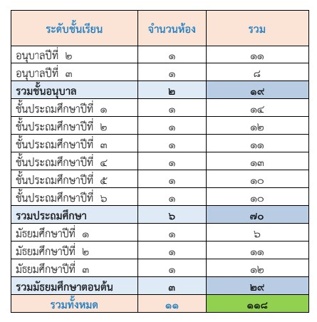 เปิดสอนระดับชั้น อนุบาล 2 ถึงระดับชั้น มัธยมศึกษาปีที่ 3