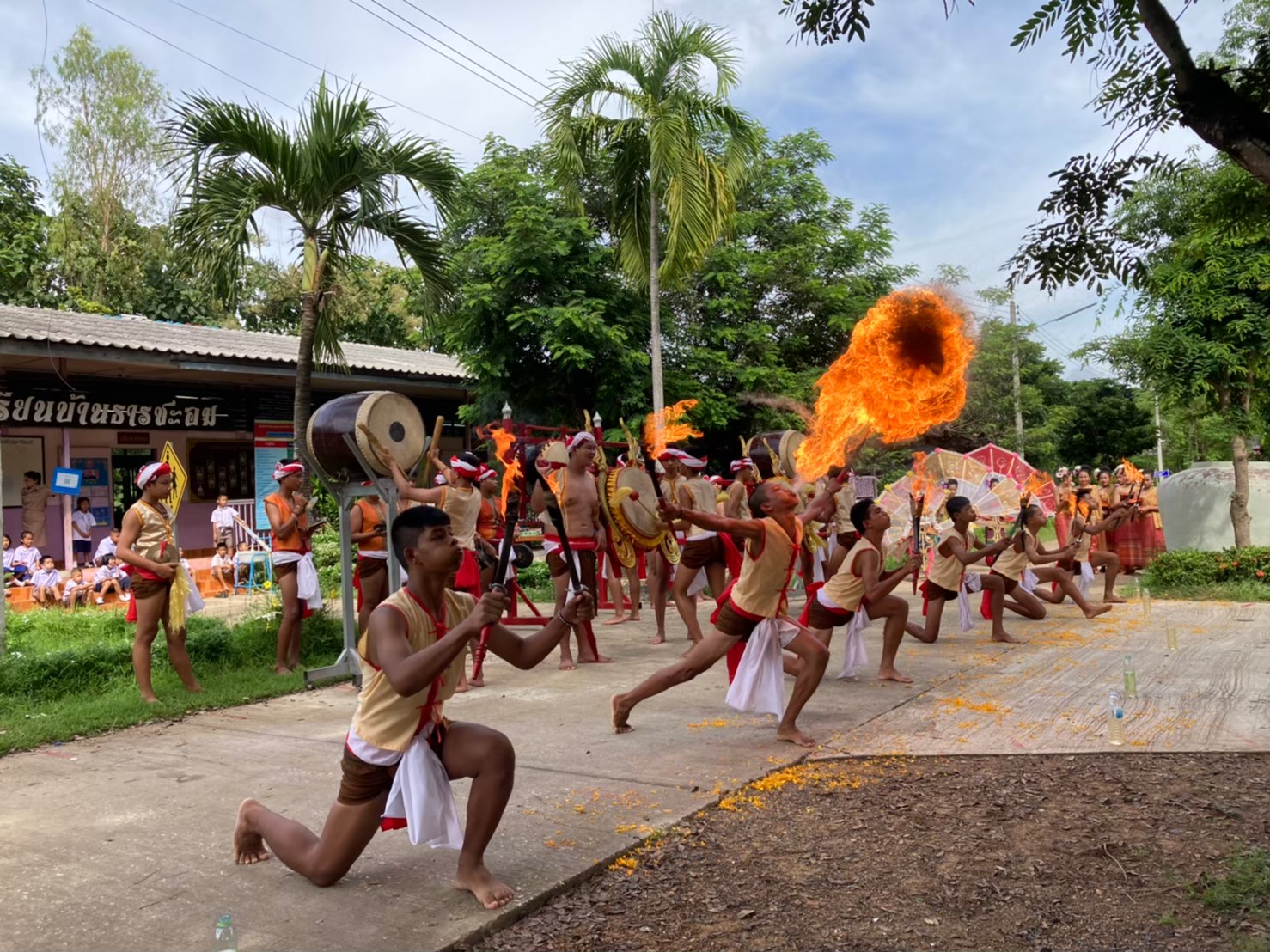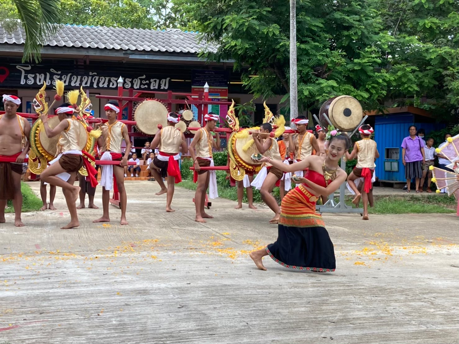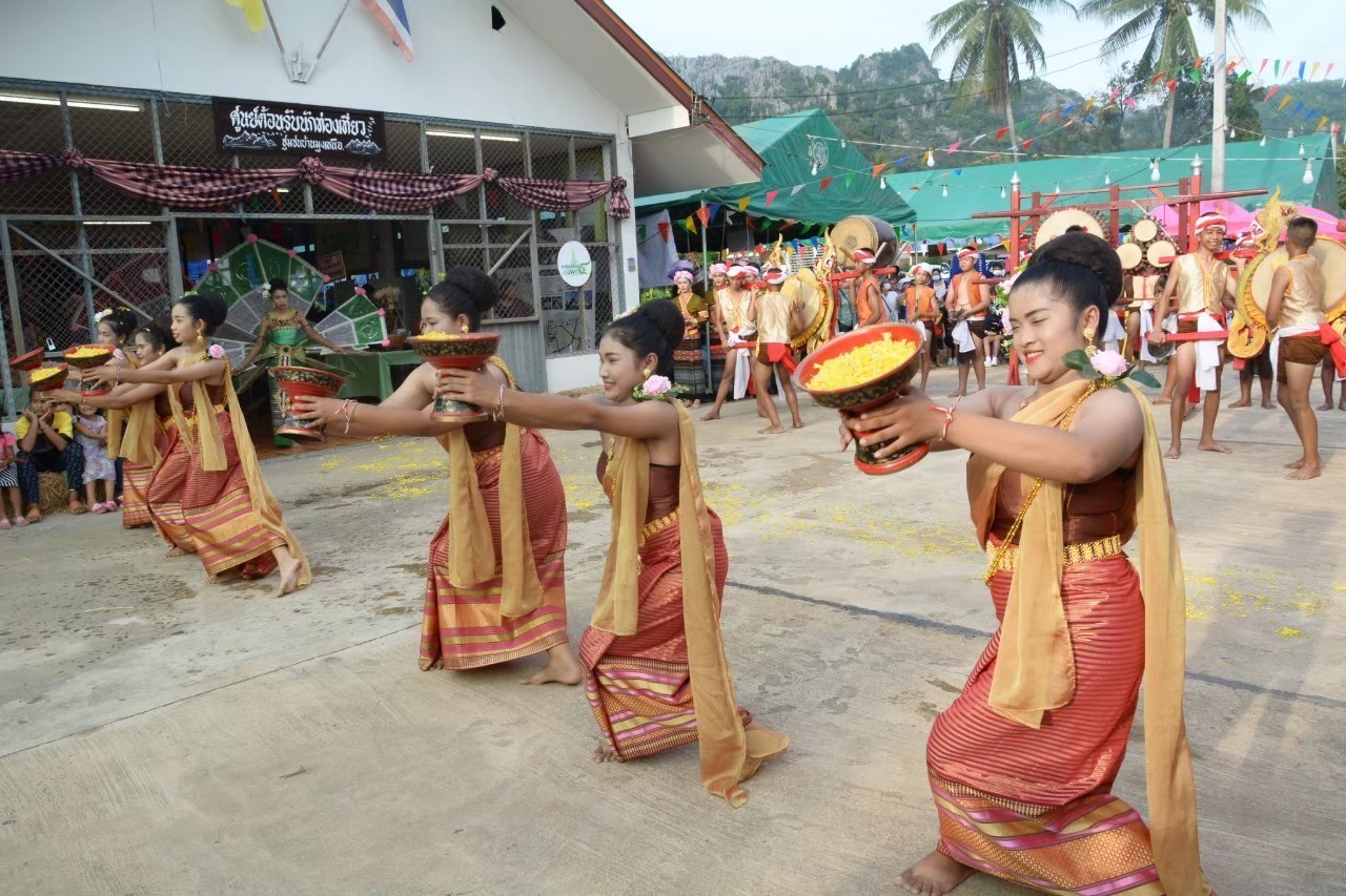 โรงเรียนบ้านธารชะอมได้เริ่มสืบสานประเพณีด้านกลองสะบัดชัย ตั้งแต่ ปี พ.ศ.2544 เรื่อยมา โดยได้รับงบประมาณสนับสนุนจากองค์การบริหารส่วนตำบลไทยชนะศึก และได้ใช้ประกอบการเรียนการสอนเรื่อยมาจนเป็นเอกลักษณ์ที่โดดเด่นของโรงเรียน ปัจจุบันโรงเรียนได้ส่งเสริมและนำกิจกรรมกลองสะบัดชัย ไปร่วมงานต่าง ๆ ของอำเภอ ของจังหวัดและจังหวัดอื่น ๆ จนเป็นเอกลักษณ์มาจนถึงทุกวันนี้
